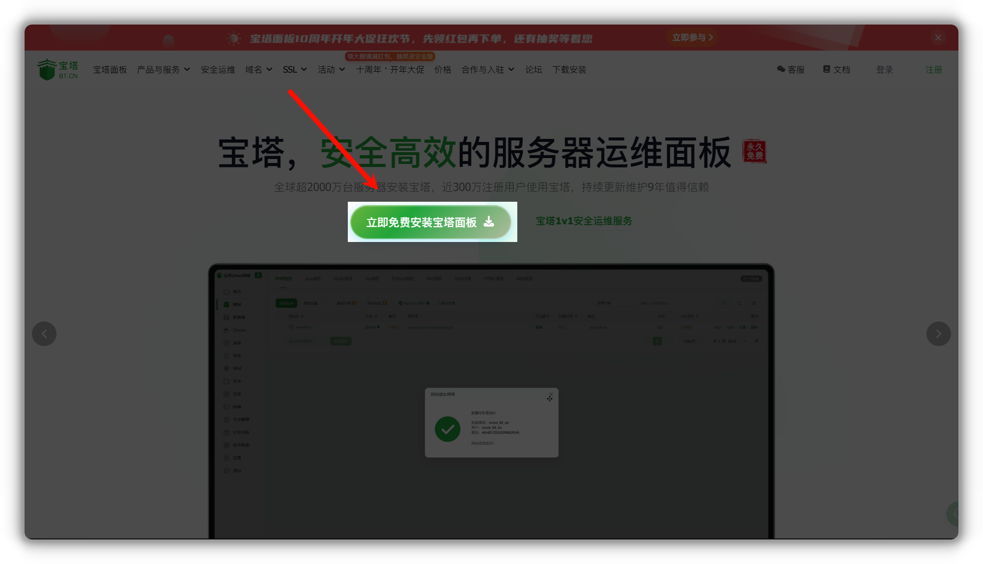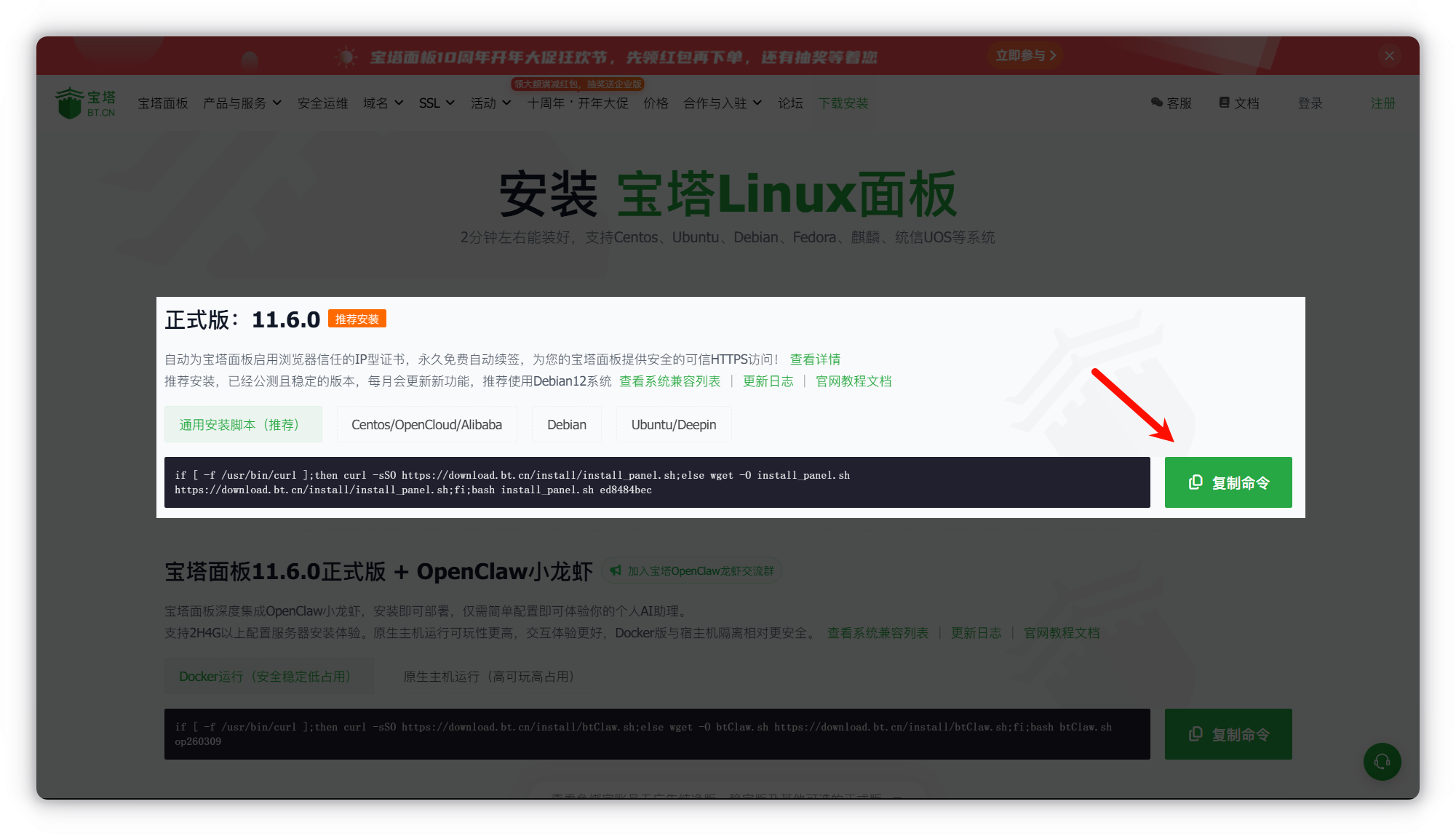 进入 宝塔官网 在首页点击 立即免费安装宝塔面板 直接复制 通用安装脚本 并粘贴至 ssh 命令行,回车,等待安装完毕(看不懂的请见 官方安装教程)