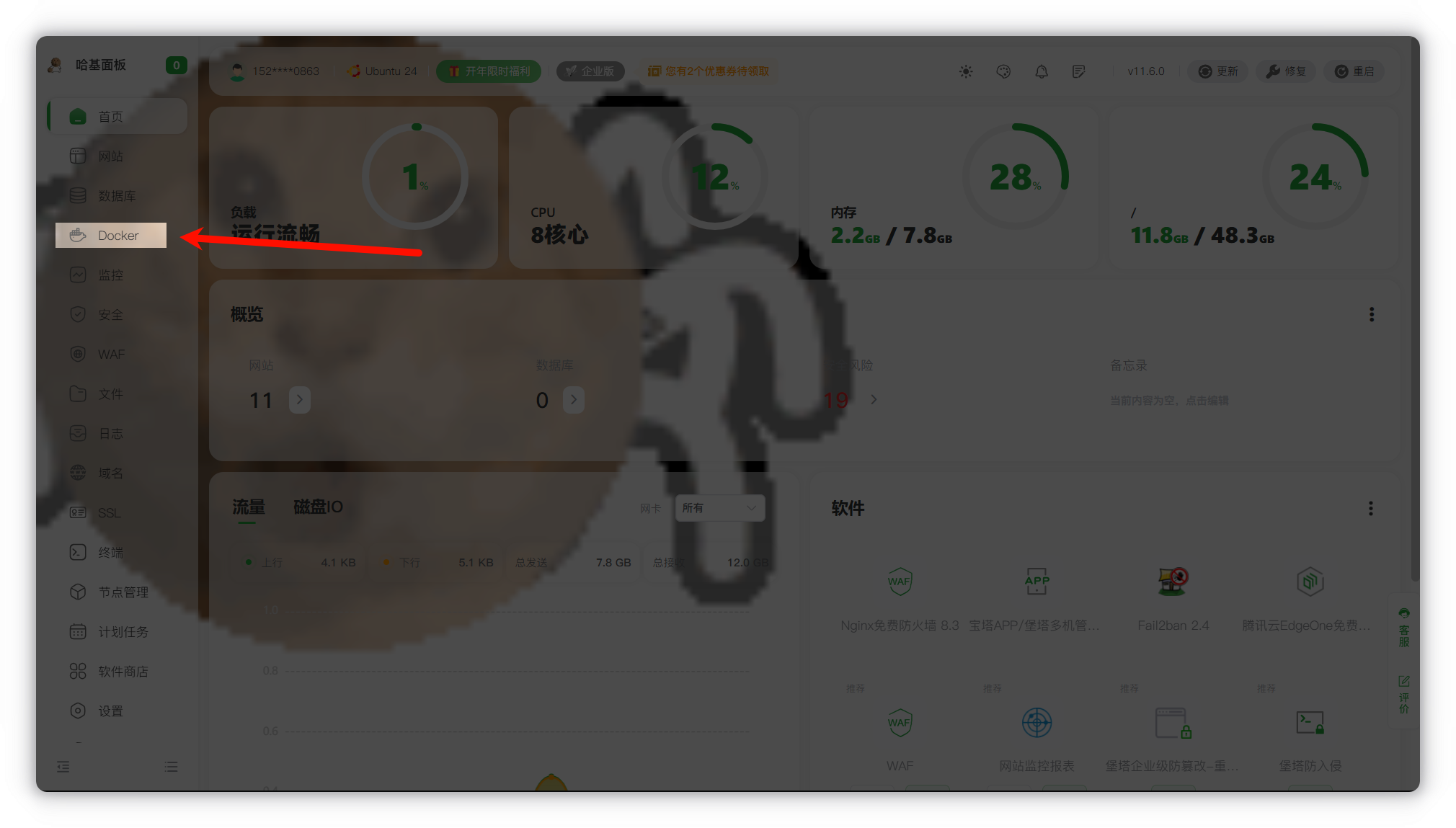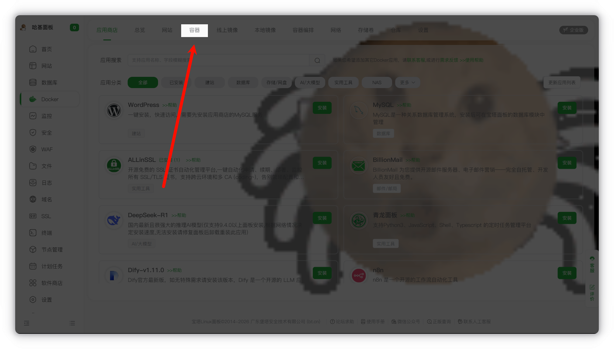 进入宝塔面板,在侧栏找到 Docker。